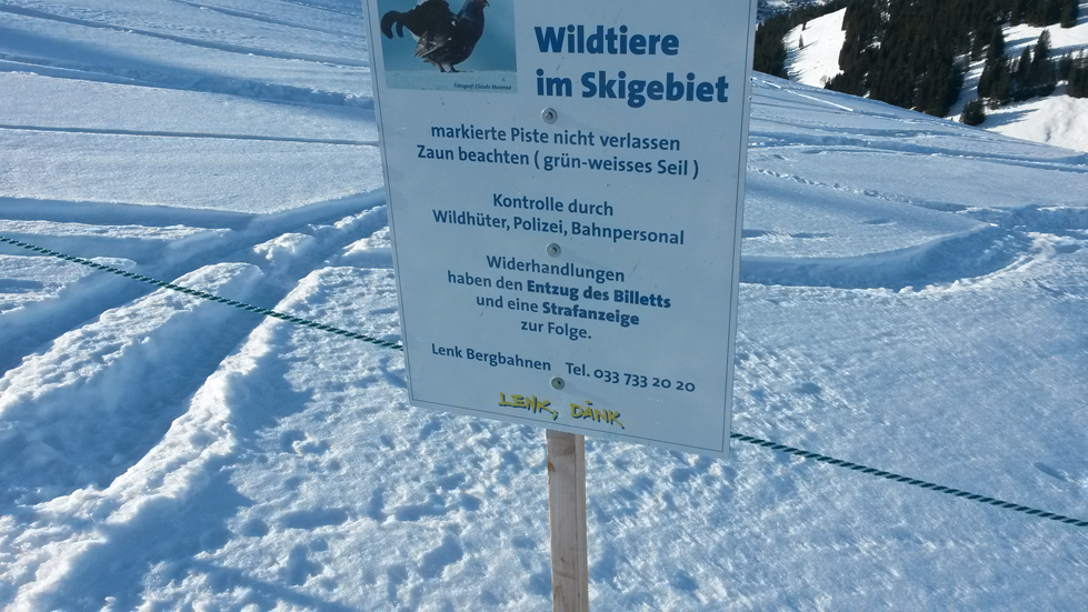 Eine namhafte Zahl von Wintersportlern foutiert sich jedoch um solche Erkenntnisse und um Absperrvorrichtungen und Verbotstafeln, die zum Teil sogar Strafanzeigen androhen und fährt unverfroren durch die gekennzeichneten Wildtier-Lebensräume, wie Pingwin Planet in verschiedenen Skigebieten in Pistennähe festgestellt hat. Freiwillige von Pingwin Planet bewachten deshalb heute im Skigebiet Adelboden-Lenk (im Raum Metschstand/Hahnenmoos) solche Wald- und Wildruhezonen, um Ski- und Snowboardfahrer vom verbotenen Eindringen in diese Zonen abzuhalten oder sie zumindest für die Problematik zu sensiblisieren. Die Aktivisten brachten auch zusätzliche Informationstafeln an, welche vom Durchfahren der Wildruhezonen abhalten sollen. Eine andere Gruppe von Freiwilligen von Pingwin Planet verteilte Flugblätter mit Informationen zur Aktion.
