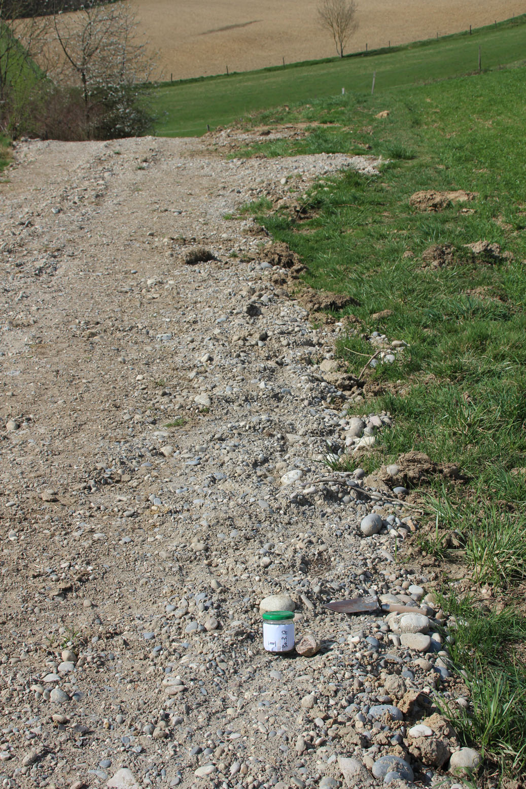durch sauberes Material ersetzen. Das aber scheint nicht wirklich geschehen zu sein. Denn: Alle vier Betonproben, die Martin Forter im Auftrag von Pingwin Planet nach dem Bodenaustausch aus diesem angeblich jetzt sauberen Feldweg entnommen hat, sind z.T. stark mit Lindan-Abfall belastet.*2 Erstaunlich auch: Am Wegrand liegen viele alte Betonbrocken, die zum Teil mit Lindan-Abfall belasteten sein dürften – ganz so, als ob sie jemand aussortiert und dort abgelegt hätte.