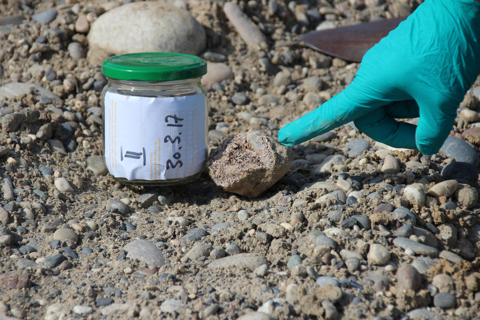 Zweite Probenahme (30.03.2017): Drei Proben bestehend aus drei Betonstücken, die das Labor einzeln analysiert hat.